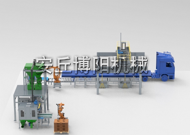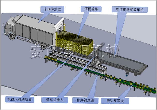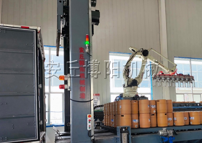 集裝箱全自動(dòng)裝車機(jī)解決方案:用于桶裝、袋裝、紙箱等的碼垛裝車,應(yīng)用車型:平板、集裝箱、貨柜等。